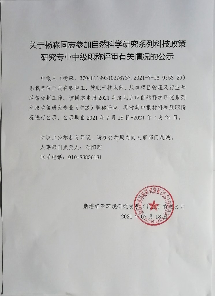申报人(杨森,370481199310276737,2021-7-16 9:53:29)系我单位正式在职职工,就职于技术部,从事项目管理及行业和政策分析工作。该同志申报2021年度北京市自然科学研究系列科技政策研究专业(中级)职称评审,现对其申报材料和履职情况进行公示,公示期自2021年7月18日-2021年7月24日。